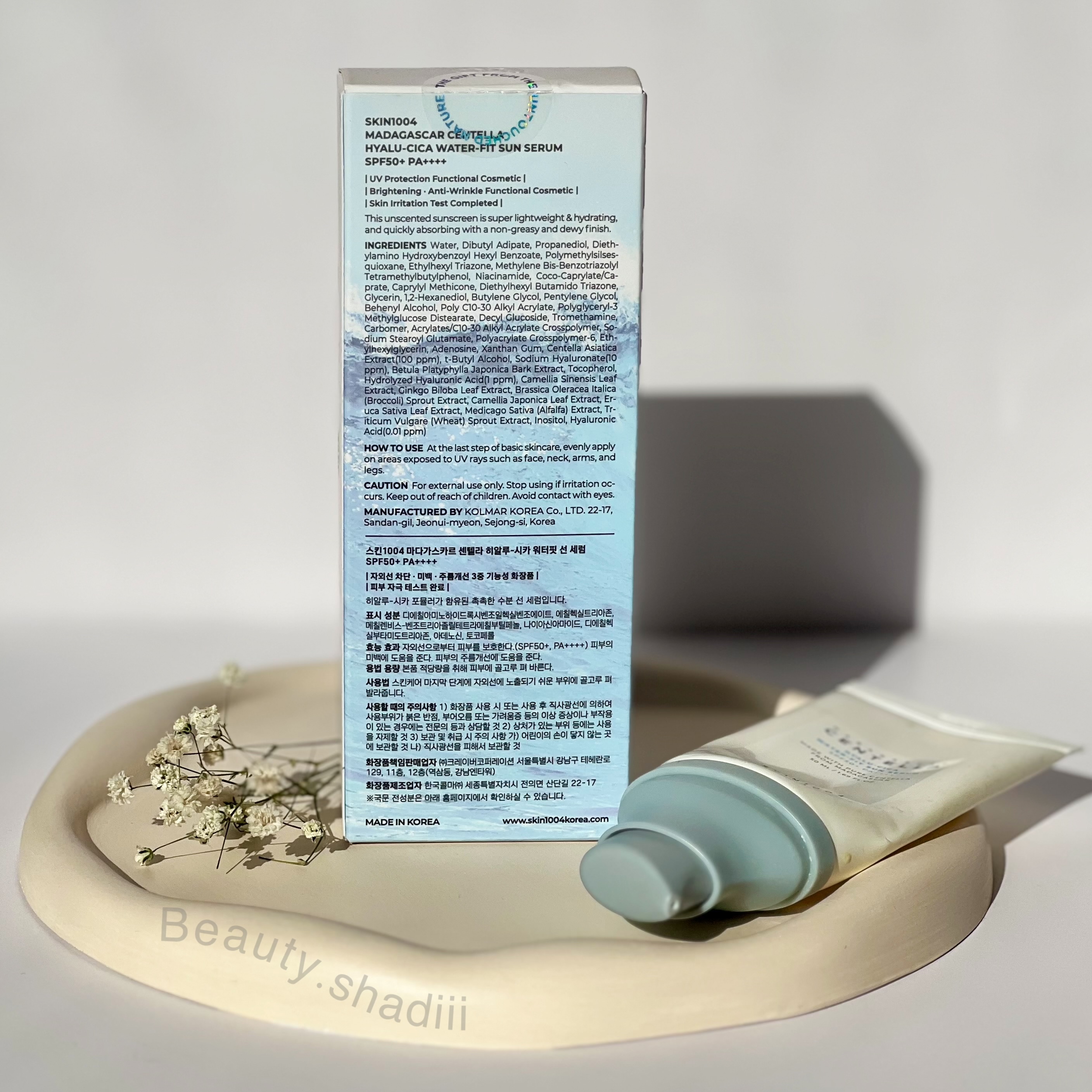 محافظت کامل پوست در مقابل اشعههای مضر نور خورشید دارای چهار فیلتر شیمیایی (tinosorb M و Unival A Plus و Unival T 150 و Isocotrizinol) حاوی عصاره گیاه سنتلا بافت سبک و بدون چربی مناسب برای انواع پوست، به ویژه پوستهای حساس محافظت روزانه از پوست آبرسانی و نرمکنندگی پوست پیشگیری از پیری زودرس قابل استفاده به عنوان پایه آرایش بافتی غیر چسبنده دارد جلوه نهایی بر روی پوست طبیعی خواهد بود سبک است و هرگز احساس سنگینی بعد از استفاده را تجربه نمیکنید روی پوست به آسانی پخش شده و پیل نمیشود رد سفیدی به جای نمیگذارد حاوی ترکیبات عالی برای تغذیه، روشن شدن و کاهش چین و چروک پوست حاوی هیالورونیک اسید برای آبرسانی به پوست حاوی نیاسینامید برای تسکین پوست حاوی ویتامین E برای ترمیم سلولی و محافظت از پوست در برابر رادیکالهای آزاد حاوی سنتلا آسیاتیکا که ضد التهاب است و افزایش دهنده سطح آنتی اکسیدان در پوست فاکتور حفاظتی : SPF50 نکات مهم هنگام استفاده · پیش از مواجهه با آفتاب استفاده کنید. · روی پوست تمیز و خشک بزنید. · پس از جذب کامل، مراحل آرایش را انجام دهید.